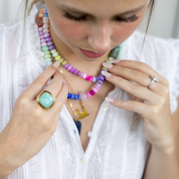 Amazonite Square Cocktail Ring set in 18k gold plated brass.