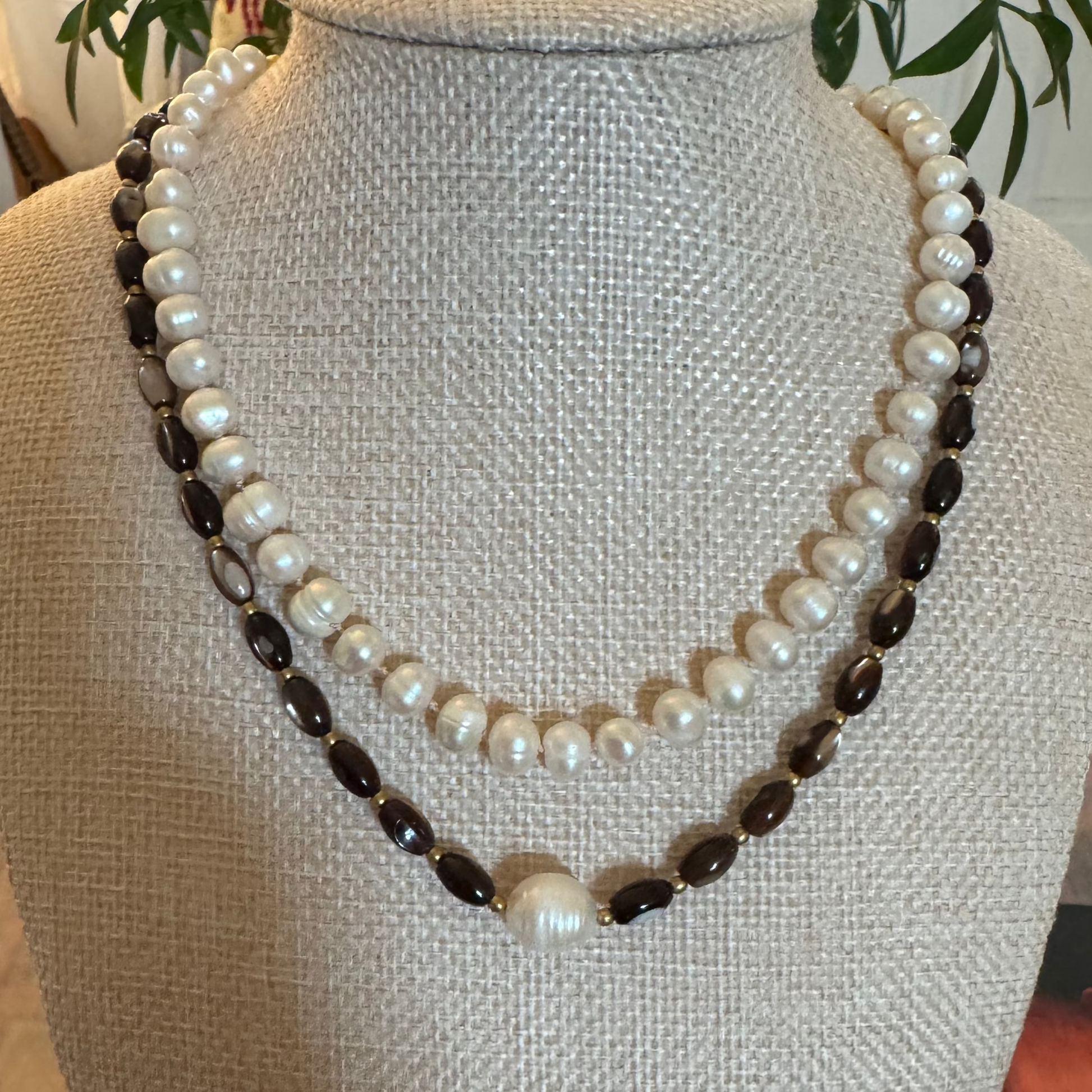 Delicate shell beaded necklace with gold beads and featuring a central freshwater pearl accent.